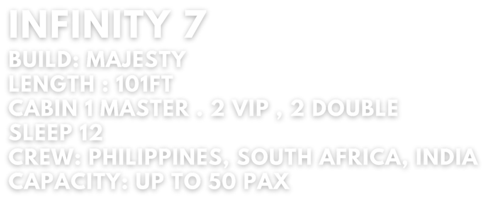 The INFINITY 7 101FT is a sleek and refined yacht that balances size, comfort, and style in perfect harmony. At 101 feet in length, it offers generous deck space for guests to enjoy open-air lounging, sunbathing, and panoramic sea views. The yacht’s graceful exterior lines and well-designed profile give it a polished, modern look — ideal for both relaxed cruising and special occasions.